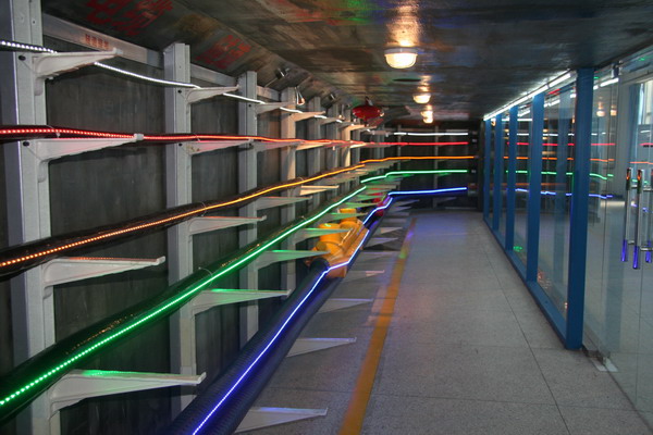 电力电缆隧道实训室位于实训辅助楼二楼,面积120平方米,隧道长度18米, 宽度2米,高度2米,隧道内设有圆形电缆隧道(2米)、方形电缆隧道(2米),电力电缆敷设在隧道内,控制通讯电缆和4层电力电缆架(角钢支架)(0.4KV,10KV,35KV,110KV各一层,每根20米)、同时有2米直埋时铺设区。隧道内有防火墙,天井,通风系统,接地。隧道内装有防爆照明灯。为了便于实训和参观电缆隧内部结构,电缆外墙为10mm强化防爆玻璃。可进行初级工入职培训、中级工技能培训、高级工技能提高培训。