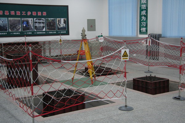 杆塔基础实训室于2009年底建成,总面积126平方米,是一个多功能一体化的综合实训室,它是运用还原法将施工现场缩至课堂,通过模拟输配电线路杆塔基础施工过程,使受训学员掌握基础施工过程中的操作技能和技术规范。