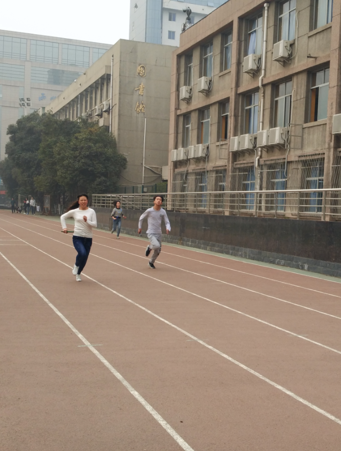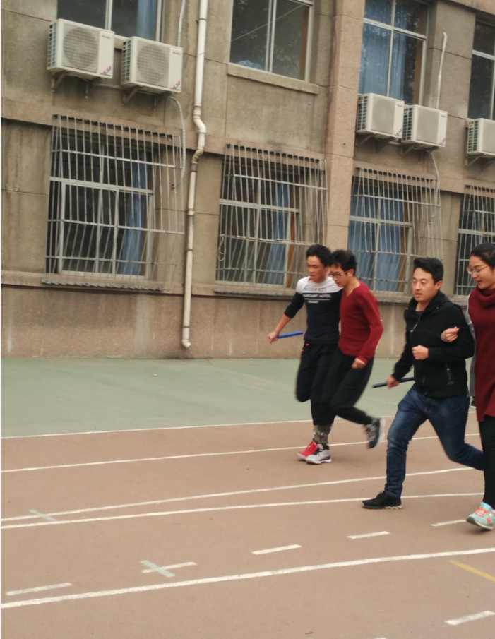 6×100米接力赛,时间定于12.9.每个班出7名同学,必须要有1名女生。在6次的接力中有4人100米的加速跑,有1人100米的拍篮球跑,也有2人100米的2人3 足跑。拍篮球跑对于篮球好的同学并没有什么难度,只要细心便很容易。而最有意思的便是2人3足,因为那需要两个人的配合与默契。此次比赛通过及时决定胜负。经过一系列比拼23161班获得了冠军。