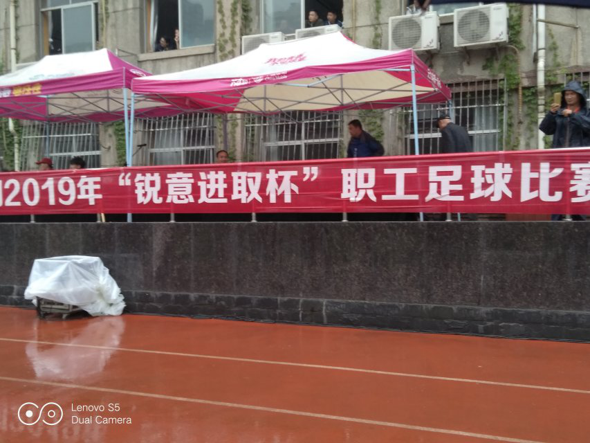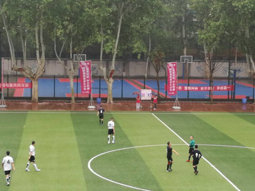 不久,双方球员和一些观众进入了场地。双方球员握手以后,随着主裁判的一声哨响,比赛正式拉开了帷幕。我们青协的成员在场边有条不紊的保证比赛顺利进行。我们有的担任计分员,有的担任捡球员,有的则是拉拉队,为自己喜欢的球员和精彩的足球比赛呐喊助威,有的手里拿着水毛巾等以备不时之需。随着比赛的进行双方队员你攻我守,你来我往我们也因为球员的精彩操作而喝彩连连。虽然天空中的雨越下越大,但是球员们冒着雨踢比赛的热情丝毫不减。他们的衣服都已经湿完了。但是他们依旧在奋力比赛。我们场边的每个青协的志愿者也都热情高涨,在保障比赛正常进行的同时,我们淋着雨给球员们大声呐喊助威。虽然我们衣服湿了,嗓子哑了。但是我们依旧坚守在比赛场地为队员们提供志愿服务。