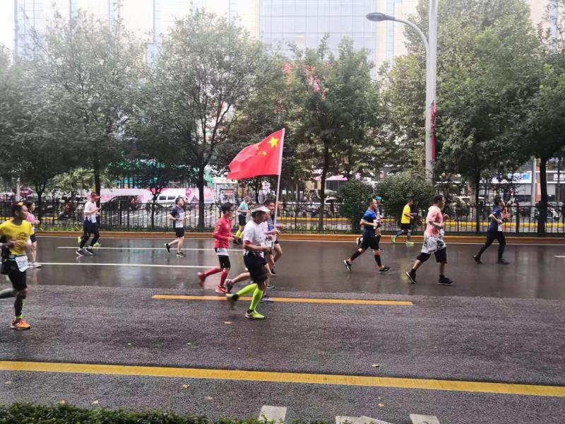 终于经过了焦急的等待,参赛者们跑到了我校志愿者所在的路段。运动员们都顶着大雨,已经连续跑了30多公里,他们是真正挑战极限的勇士。他们向我们展示了生命的活力和意志的顽强。我们被深深地感染。我校志愿者站在雨中用尽全身的力气。为勇士们呐喊加油。大家激动的挥舞着双手,用尽全身气力好似要把自己的力量灌输在勇士们的身上去。天空也好似感受到了大家的热情,不一会儿雨停了。