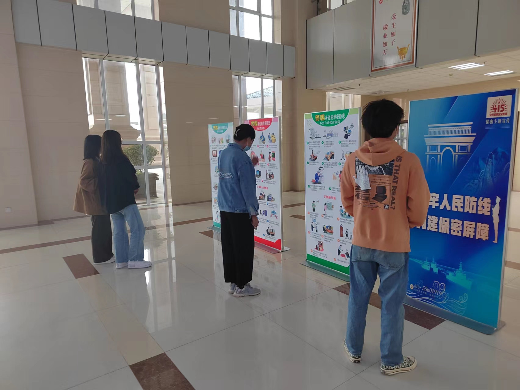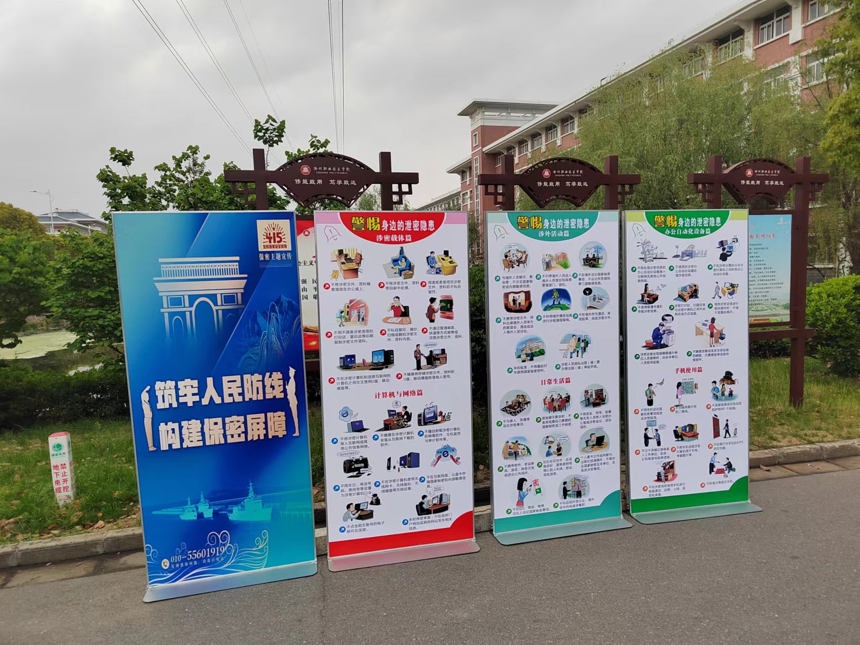 同时校党政办还在综合楼大厅及学生公寓入口处摆放保密宣传挂画,提醒广大师生注意警惕身边的泄密隐患,在日常生活和涉外活动中时刻保持警醒,谨慎使用办公自动化设备和信息设备,防范来自互联网的泄密风险,绝不做危害国家安全的事情。