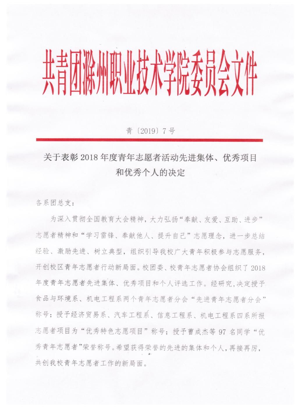 201907关于表彰2018年度青年志愿者活动先进集体,优秀项目和优秀个人的决定