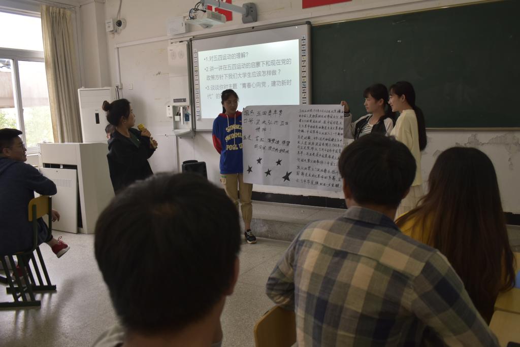 4月25日中午,17食品营养团支部召开主题团日,食环系团总支组织团干进行现场观摩。活动由该班班长陈晨同学主持,他首先播放了五四运动相关影片;随后,团员代表赵守语同学进行五四主题演讲,团支部书记洪欣同学讲解五四经典图片资料,向支部团员发出继承弘扬五四精神、争做时代新人的号召。班级团员分五组开展了五四精神学习和讨论,并对学习结果进行展示、汇报。最后,团支部带领全体团员重温入团誓词、找寻入团初心。