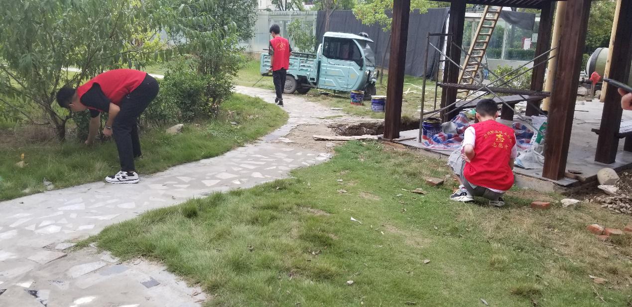 社区内,志愿者们帮忙清理建筑垃圾,绿化带内的果皮纸屑以及杂物,几名新生积极参与其中。