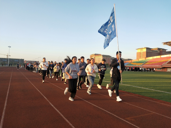 在学生会主席张阳、副主席杜庆龙、陶萌的带领下,学生会全体干事们伴着清晨的微风,排着整齐的队伍,在学校操场内的塑胶跑道上一同奔跑。