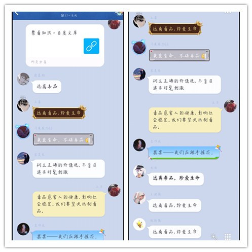 主题团日活动内容主要为各班团支书利用班级QQ群发送禁毒知识的相关链接及视频,同学们了解了毒品的危害性和毒品的概念、种类等内容。随后,大家踊跃分享自己的感悟,表示要做到一个不碰毒,不宣毒,不问毒的青年大学生,要珍爱生命,远离毒品。
