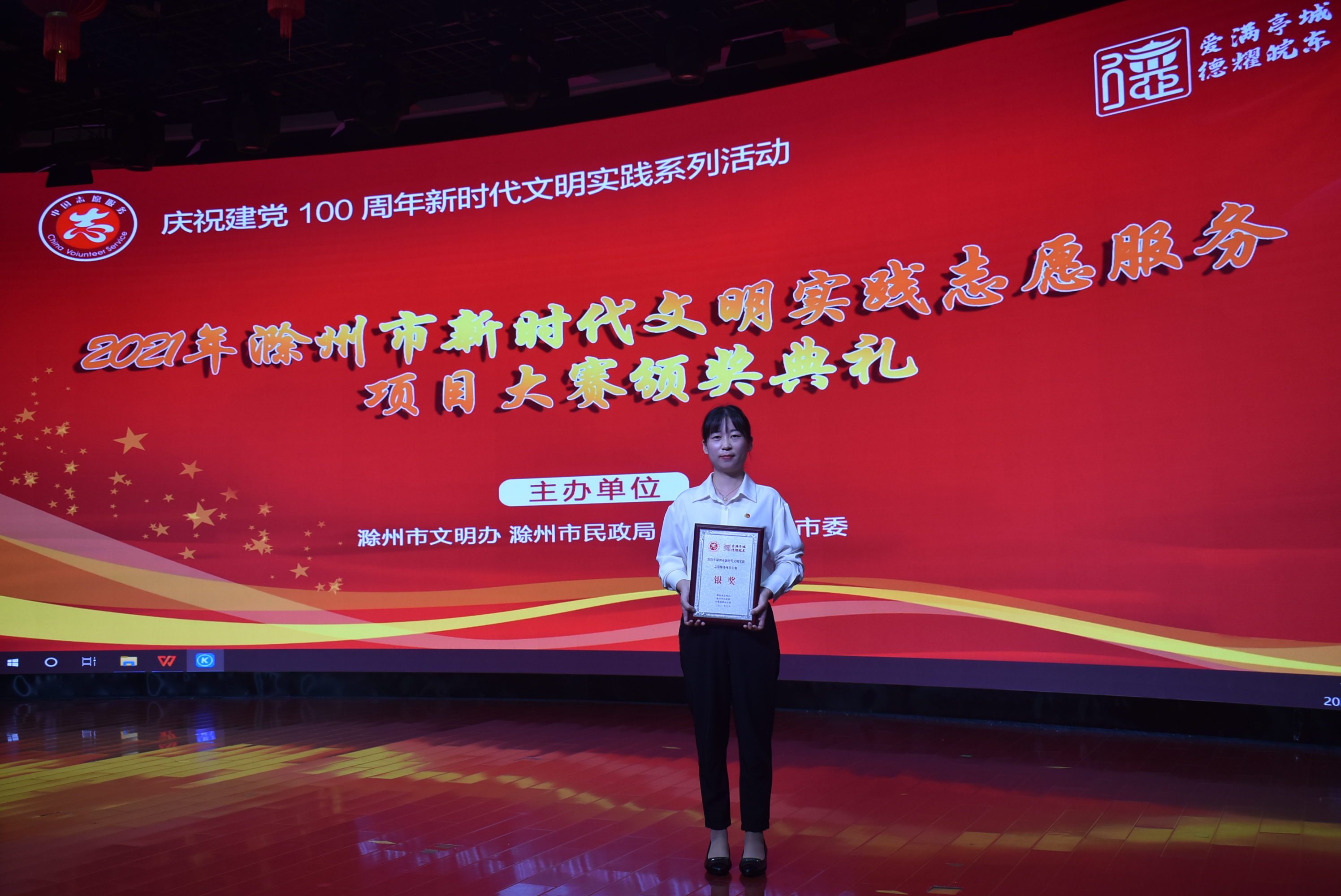 9月29日下午,2021年滁州市新时代文明实践志愿服务项目大赛在滁州市第二实验小学报告厅举行。新葡的京官网食品与环境工程学院“萤火虫·环保”志愿服务项目在比赛中喜获银奖,团总支指导老师李瑞瑞作为项目负责人作现场汇报,经过激烈的角逐,最终取得银奖的好成绩!