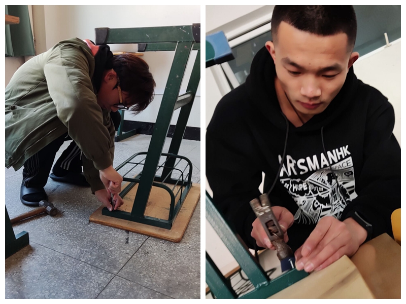 学生会实践公益部成员带上锤子、钉子等工具,逐个教室排查破损桌椅。同学们发扬不怕苦、不怕累的精神,一张张查,一锤锤钉,团结一心、齐心协力,顺利的完成了义务维修活动。
