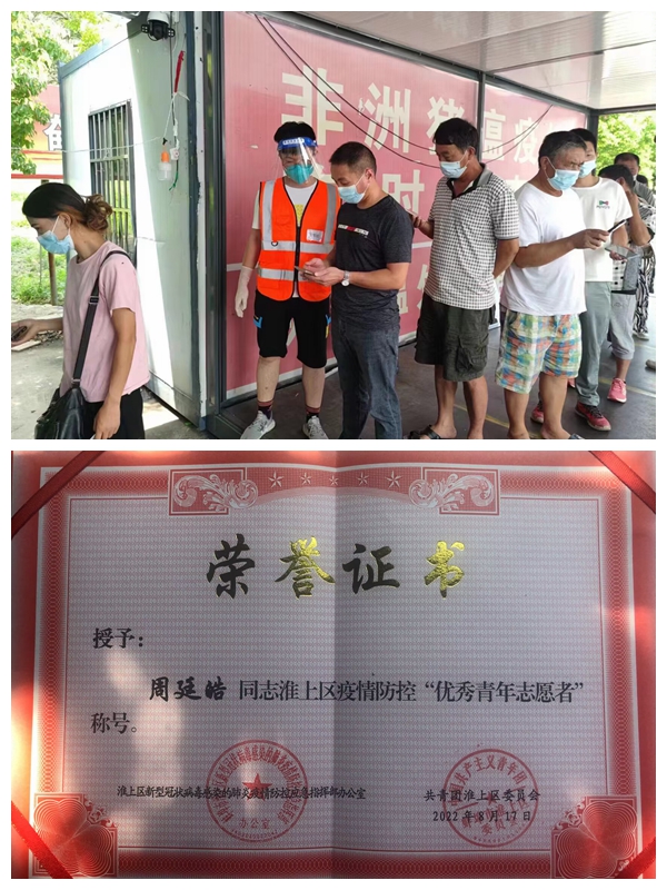 21级环境工程周廷皓同学积极响应蚌埠市团委号召,加入疫情防控青年突击队,协助开展核酸检测、防疫宣传等工作,前后持续近两个月时间,他表示:“此次经历让我学到很多书本上学不到的东西,能为家乡防疫工作做出力所能及的贡献,我感到十分荣幸。”