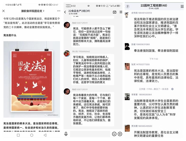 本次活动紧紧围绕“学习宣传贯彻党的二十大精神,自觉维护宪法权威”主题。在全院范围内以微信公众号、班级QQ群等方式宣传以宪法为核心的法治教育;各班级开展国家宪法日“宪法晨读”活动,带领青年学生了解并学习宪法知识;开展“职教生心中的二十大”主题班会活动,宣传宪法知识;开展防疫安全法治警示学习教育,各班以线上宣传和线下班会相结合的方式展开学习,提升同学们法治意识。