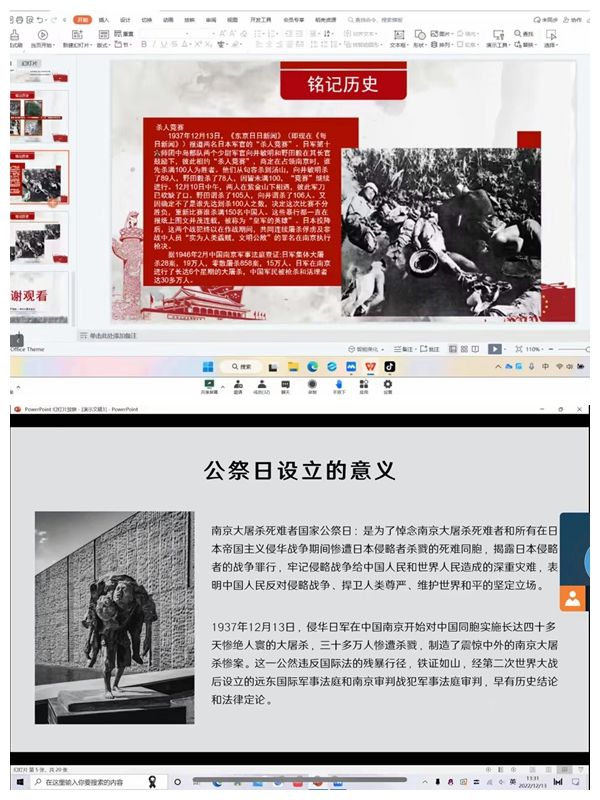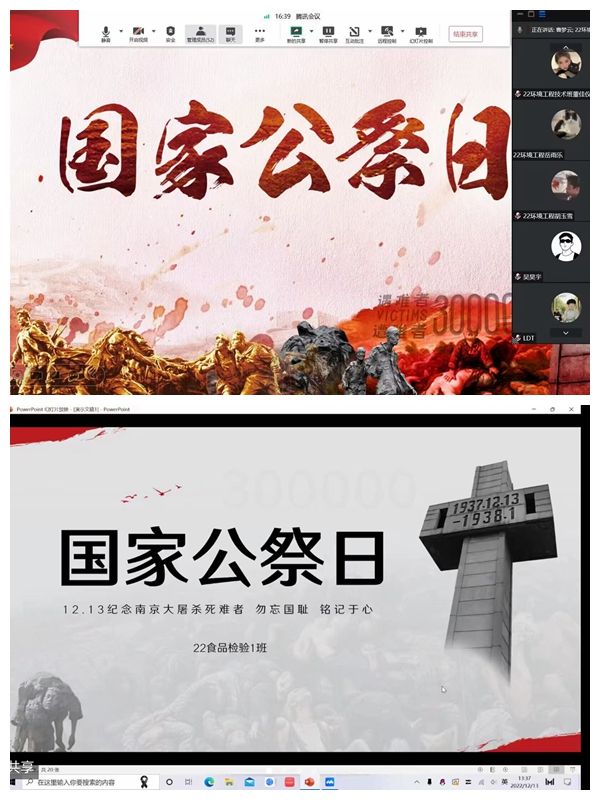 活动当天,各团支部组织班级同学登录“中华英烈网”开展网上祭英烈活动,通过点烛祭奠、献花追思、撞钟警世、祈愿留言等方式缅怀革命先辈,增强感恩奋进的精神力量。并组织学生观看相关视频,回顾“南京大屠杀”那段屈辱的历史,缅怀所有惨遭日本侵略者杀戮的死难同胞。其中,22化工1班的团支书通过PPT展示了部分史实资料,向同学们介绍了设立“国家公祭日”的设立过程与意义,致敬所有为中国人民抗日战争胜利献出生命的革命先烈和民族英雄。