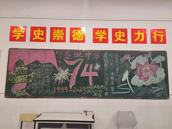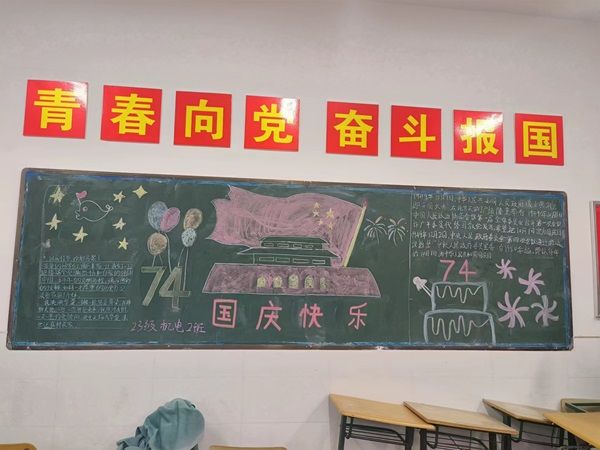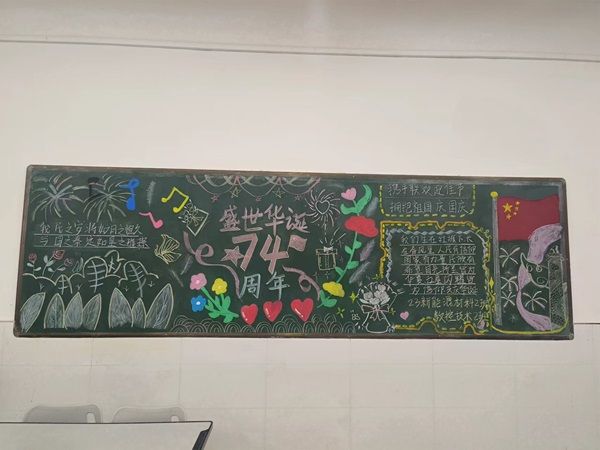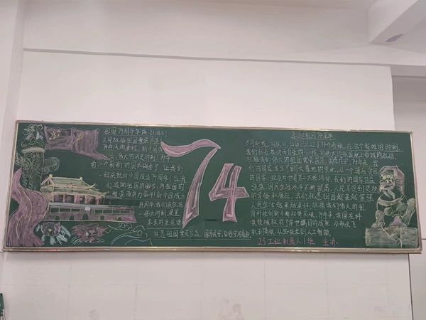 在院团总支和各班班委的带领下,同学们积极行动,精选素材,精心设计版面,用粉笔书写、以图画传情,向祖国母亲献礼。同学们以一块黑板为框架,以粉笔、颜料为工具,谱写爱国情怀,细致笔触,勾勒出一幅幅美丽画卷。让一个个黑板演绎出跳动的气息,以丰富多彩且充满青春活力的画面呈现在我们的眼前。同时在这充满意义的节日里,我们更要坚持中国特色社会主义道路,为实现中华民族伟大复兴的道路而铺砖添瓦,贡献出自己力所能及的力量。此次活动,让我们共庆祖国华诞,共享祖国荣光,黑板上的字画同时彰显了我们现如今拥有的强大的自信力,深深的为祖国而感到无比骄傲和自豪。