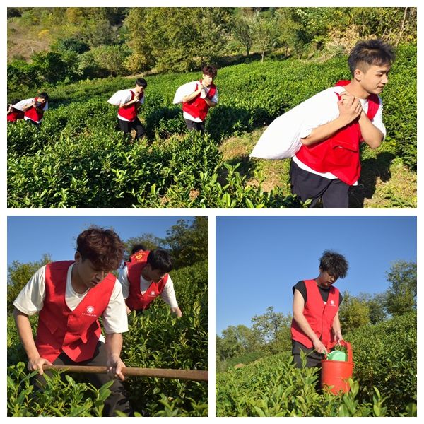 在风景优美,错落有序、茶韵气息十足的茶园梯田里,同学们充满了干劲,迫不及待的投入到劳动中,提着桶、扛着肥料、杵着锄头,到达施肥地点,同学们分工明确,挖坑、施肥、掩盖,一气呵成。尽管天气很炎热,但丝毫没有影响大家劳动的热情!“志愿红”和“茶园绿”交相辉映,成为秋日茶园里一道靓丽的风景线!