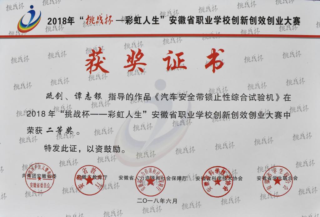 2018年“挑战杯—彩虹人生”安徽省职业学校创新创效创业大赛2018年5月初正式启动,由团省委、省教育厅、省人社厅、省科协、省学联共同主办,大赛设中职组、高职组竞赛。本次大赛启动后,得到全省各职业学校的积极响应和参与,经过市级遴选,共有128件作品入围省赛决赛评审。汽车工程系3件作品成功入围高职组创意设计竞赛。