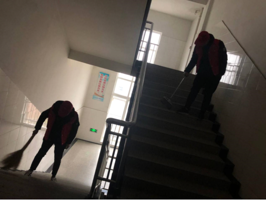 同学们有的用扫帚打扫地上的烟头,有的用手捡起来包装袋。一个同学拿着扫帚,另一个就用工具承装,打扫完后再用拖把给灰尘拖掉。同学们都在互帮互助中感受集体的力量。