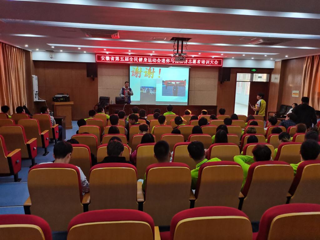 为确保安徽省第五届全民健身运动会迷你马拉松赛事的顺利进行,赛事组委会于10月8日在新葡的京官网南阶205教室对 50名志愿者和各工作组老师进行了专门培训。