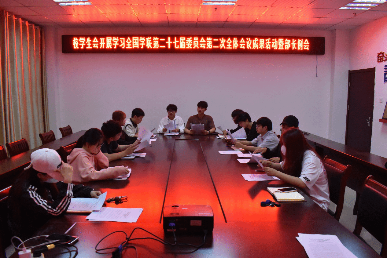 2023年5月22日,校学生会在大学生活动中心309召开了全国学联第二十七届委员会第二次全体会议成果学习活动暨部长例会。会议由主席团成员侯应东主持,部门负责人参加。