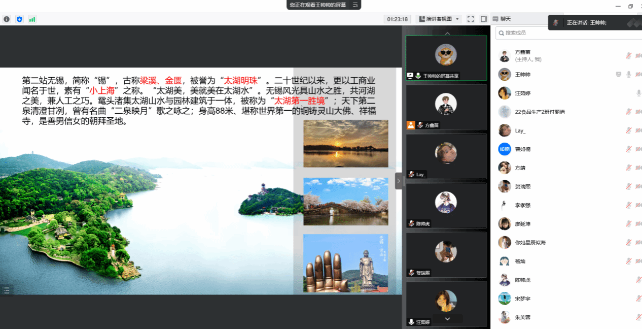 参赛选手充分的做好了活动的前期准备工作,以PPT的形式充分展示了自己心目中最美的旅游线路的分享,参赛选手分享选择本条最美旅游线路的原因。美在何处并且分享这条线路对自己而言的意义。线路的分享分别从春夏秋冬四季进行分享。充分展示了同学们对旅游的热爱。最后王帅帅同学、陶媛同学的分享获得了“最美旅游线路展示”一等奖。