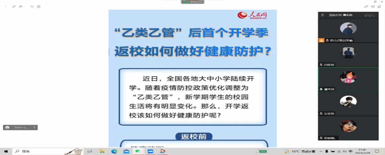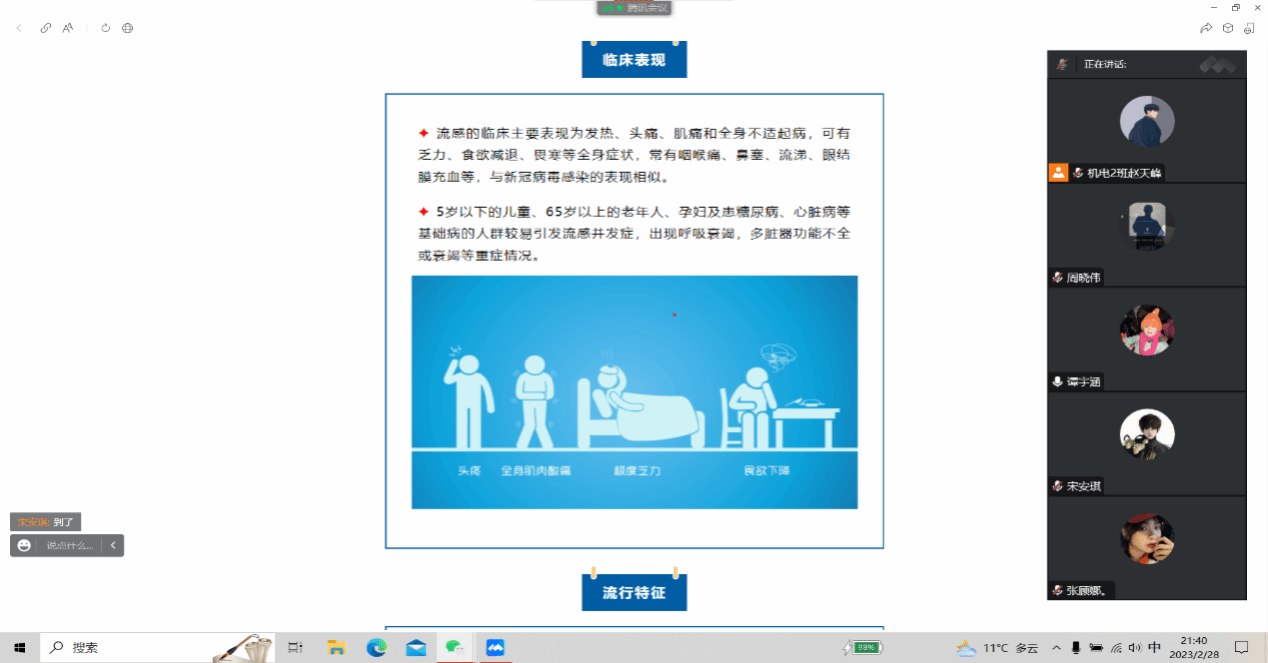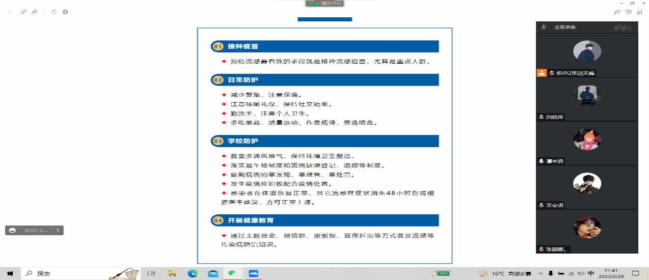 2月28日晚上,新葡的京集团35222vip科技发明与创新协会开展“警惕甲型流感 ,预防传染病”主题线上会议。通过此次会议,希望同学们增强自觉预防疾病的意识,养成爱干净、讲卫生的健康习惯,共同营造一个安全洁净的校园环境。协会会长赵天峰同学向大家普及甲型流感小知识,介绍如何做好流感预防,以及感染甲型流感如何应对等防控知识。会议中社员们不仅进一步了解了甲型流感的特点,知道了甲型流感的传播途径,还对流感和普通感冒的区别有了一定的认知。会议结束后社团成员们还就流感的治疗原则、流感的消毒以及预防的基本常识进行了自主学习。