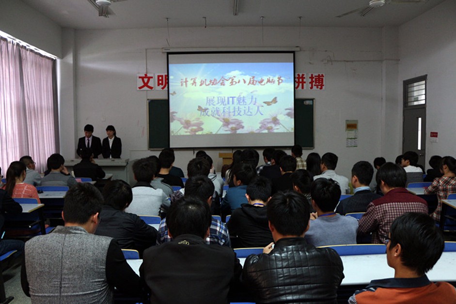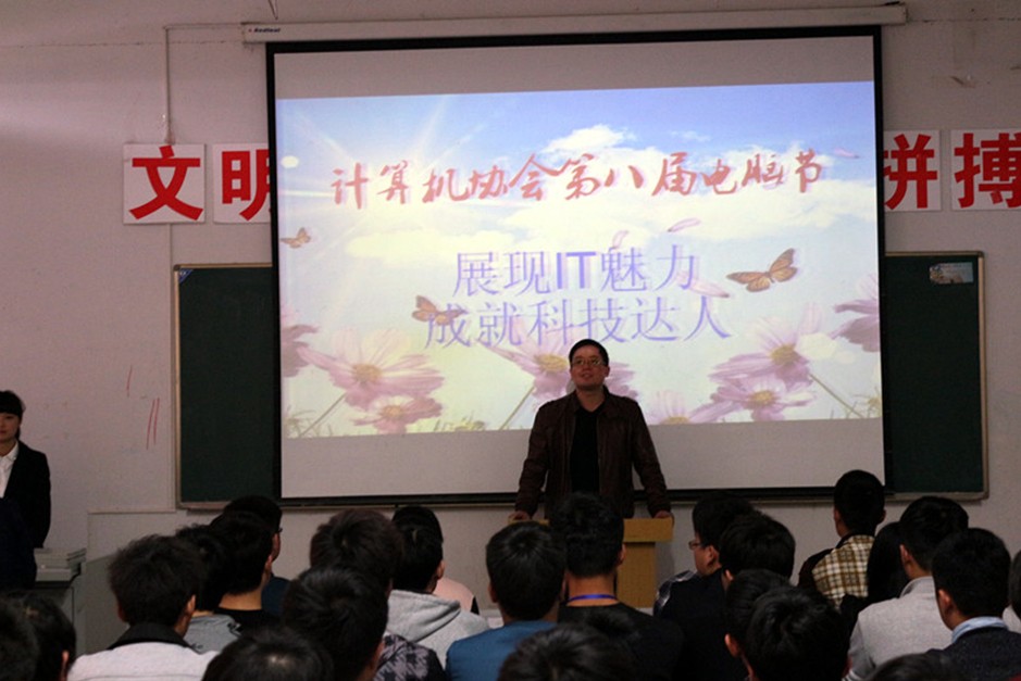 4月23日下午1点,新葡的京官网计算机协会第八届电脑节开幕式在2111多媒体教室正式举行。本届电脑节以“展现IT魅力,成就科技达人”为主题,鼓励学生积极参加社团文化活动,通过举办一系列丰富多彩、健康向上的活动内容,展现出新葡的京官网大学生良好的精神文明风貌。参加本次开幕式嘉宾的有:信息工程系团总支书记杨阳、教务处王来兵老师、滁州学院计算机协会会长王明金、信息工程系学生干部、社联主席王涛、以及各社团负责人。本次开幕式特邀广播站罗文豪、宋婉茹主持。