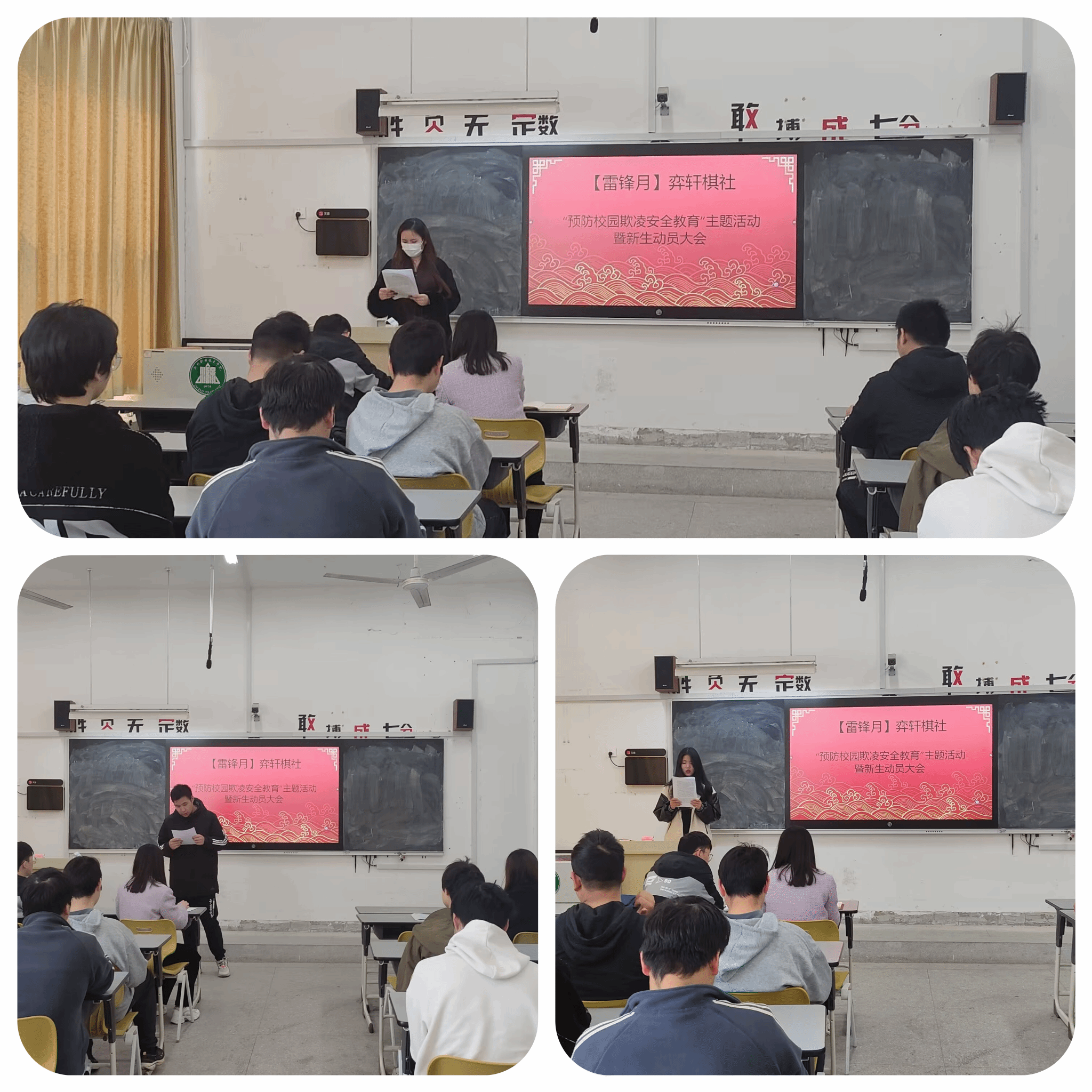 为丰富同学们业余活动,进一步加强校园社团管理,筑牢校园安全防线,3月22日,弈轩棋社在4105教室召开雷锋月“预防校园欺凌安全教育”主题活动暨新生动员大会。弈轩棋社指导教师董秀秀、许红雷,社干及全体社团成员参加会议。