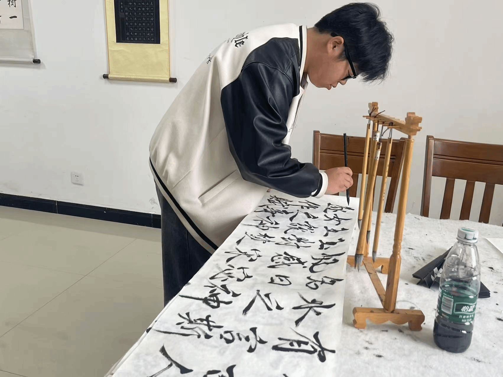 书法爱好者们热情澎湃。他们纷纷铺开宣纸,拿起毛笔,在墨香四溢中尽情挥洒,展现了对书法艺术的无尽热爱。无论是笔力遒劲、结构严谨的楷书,还是流畅自然、飘逸洒脱的行书,抑或是古朴典雅、韵味悠长的隶书,每一幅书法作品都凝聚了社员们的心血与情感。