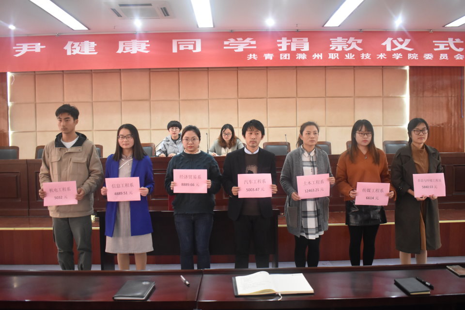 2018年10月24日下午3时,校团委在综合楼五楼报告厅举行了捐款仪式,校团委书记朱婷婷、各系部团总支书记、各系部学生代表以及“小青亭”志愿者代表参加了捐款仪式,经过几天的捐款,总共筹得善款50013.14元。并希望尹健康同学能够以乐观向上的精神积极配合医生治疗、战胜病魔,早日回到学校。