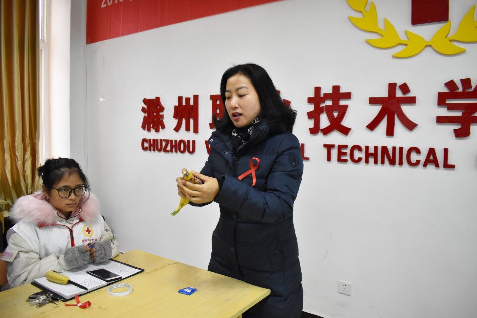 在第二天的培训中,完成活动准备后,黄卓君老师为同学们播放了预防艾滋病宣传片,同时强调了安全套对预防艾滋病的重要作用,用香蕉作为道具向同学们演示如何正确的使用安全套并将红丝带放在手心处发表自己对预防艾滋病知识的见解。