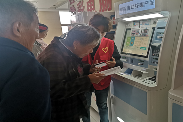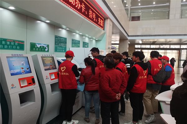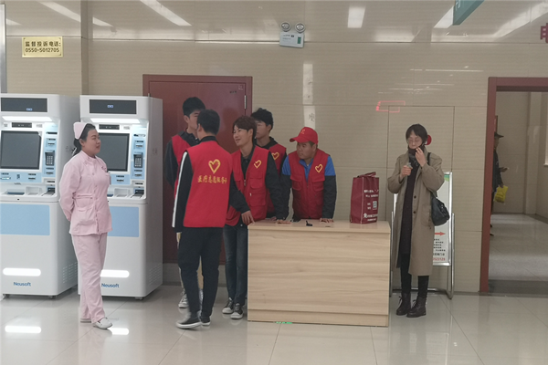 到达医院后由医院的负责人叶转桃叶主任和一名护士的带领下,志愿者们领取志愿者服装,同时初步的认识了医院的各个科室。主要在挂号机处服务,为患者解答门诊挂号,费用报销,取药,自动办卡取报告单,的问题的咨询,以及搀扶受伤人员,志愿者的身影充斥着医院的每个角落。
