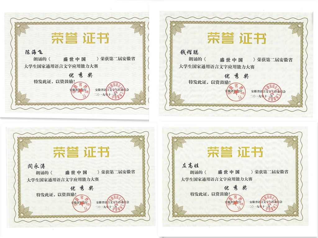 由安徽省教育厅、安徽省语言文字工作委员会主办,合肥工业大学承办的第二届安徽省大学生国家通用语言文字应用能力大赛在合肥工业大学隆重举行。新葡的京官网左高娃、陈海飞、钱熠聪、闫永涛同学的朗诵作品《盛世中国》获得优秀奖。