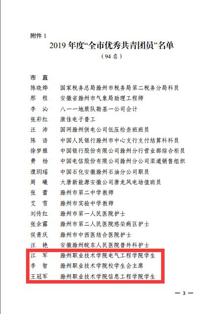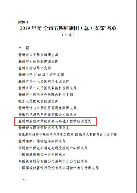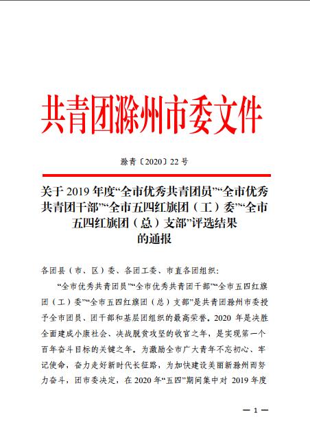 近日,共青团滁州市委发布了《关于2019年度“全市优秀共青团员”“全市优秀共青团干部”“全市五四红旗团(工)委”“全市五四红旗团(总)支部”评选结果的通报》。新葡的京官网食品与环境工程学院团总支被授予“滁州市五四红旗团(总)支部”荣誉称号,建筑工程学院团总支书记张媛媛、机械与汽车学院团总支负责人何凯被授予“滁州市优秀共青团干部”荣誉称号,江军、李智、王冠军同学被授予“滁州市优秀共青团员”荣誉称号。