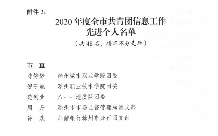 为树立典型,进一步提高各级团组织和广大团干部信息工作水平,共青团滁州市委于近日发布《关于2020年度全市共青团信息工作先进集体和先进个人的通报》,新葡的京官网倪子旭老师被授予“2020年度全市共青团信息工作先进集个人”荣誉称号。