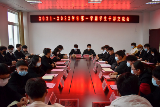 2021年12月24日中午,校团委于大学生活动中心317会议室开展期末学干交流会。校团委书记朱婷婷、副书记甄帅、校团委老师以及全体学生干部参加本次交流会。交流会由校团委副书记甄帅主持。