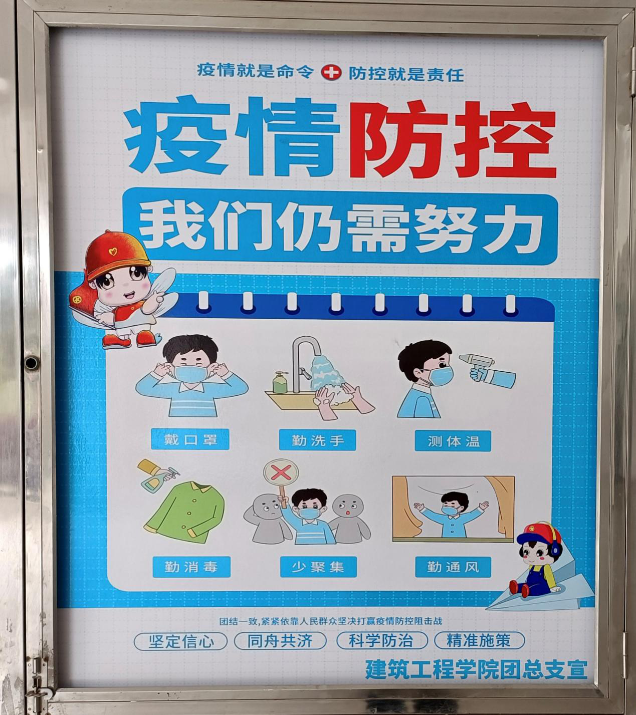 当前,为加强校园疫情防控常识和防控举措的宣传力度,为新葡的京官网疫情防控工作营造良好舆论氛围,校团委开展“五个一”宣传工作助力学校疫情防控。