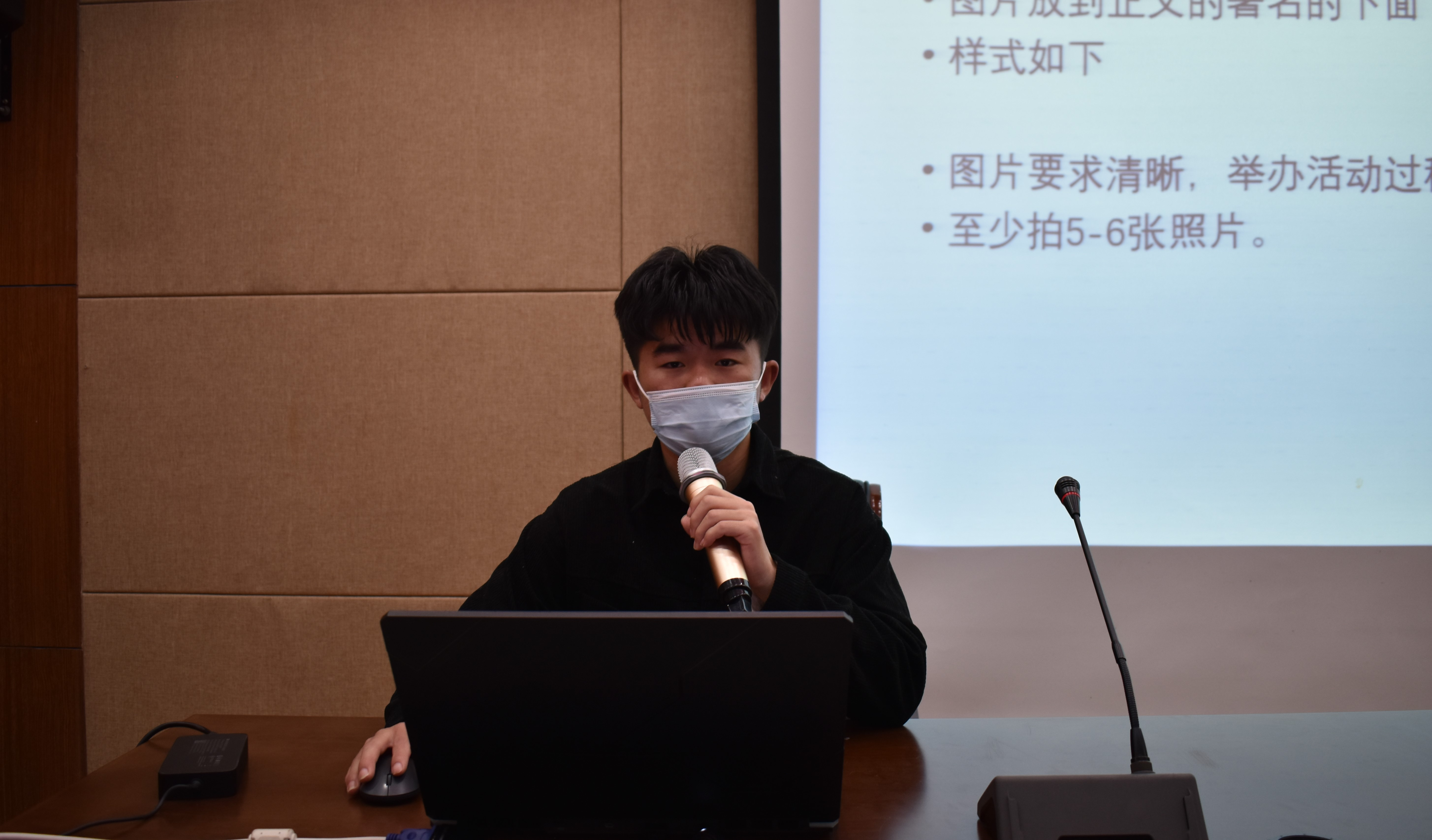 会上,先由宣传部部长张志进行发言,讲解了新闻稿的具体格式以及怎么去写好新闻稿。然后由社联指导老师陈苗发言,对新闻稿照片质量作了强调,并向大家详细解读了新一年社团星级评比细则。最后,陈老师向大家布置了社团的近期任务,鼓励各个社团充分展现大学生的朝气,积极参与到校园文化建设中来。会议在严肃又不失活泼的气氛中圆满结束。