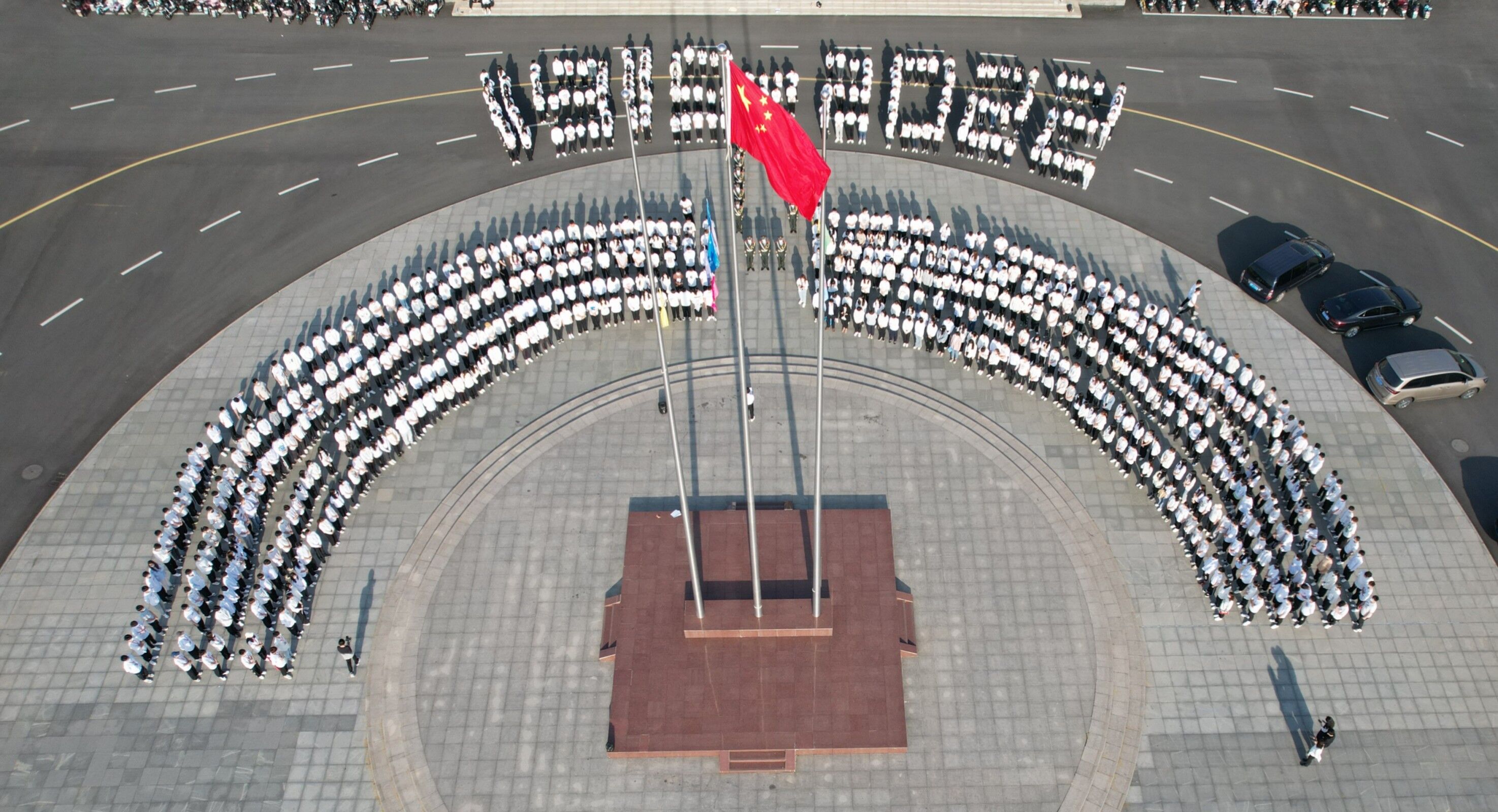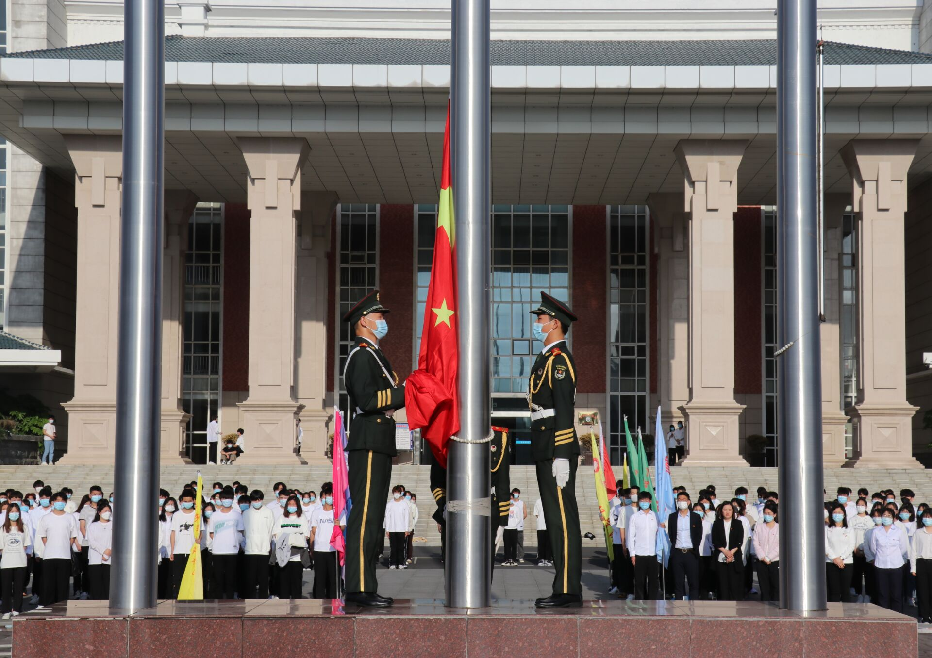 在明媚的晨光中,随着主持人宣布活动正式开始,国旗护卫队迈着整齐有力的步伐,护送国旗至升旗台前。伴随着慷慨激昂的《义勇军进行曲》,五星红旗冉冉升起,迎风飘扬。