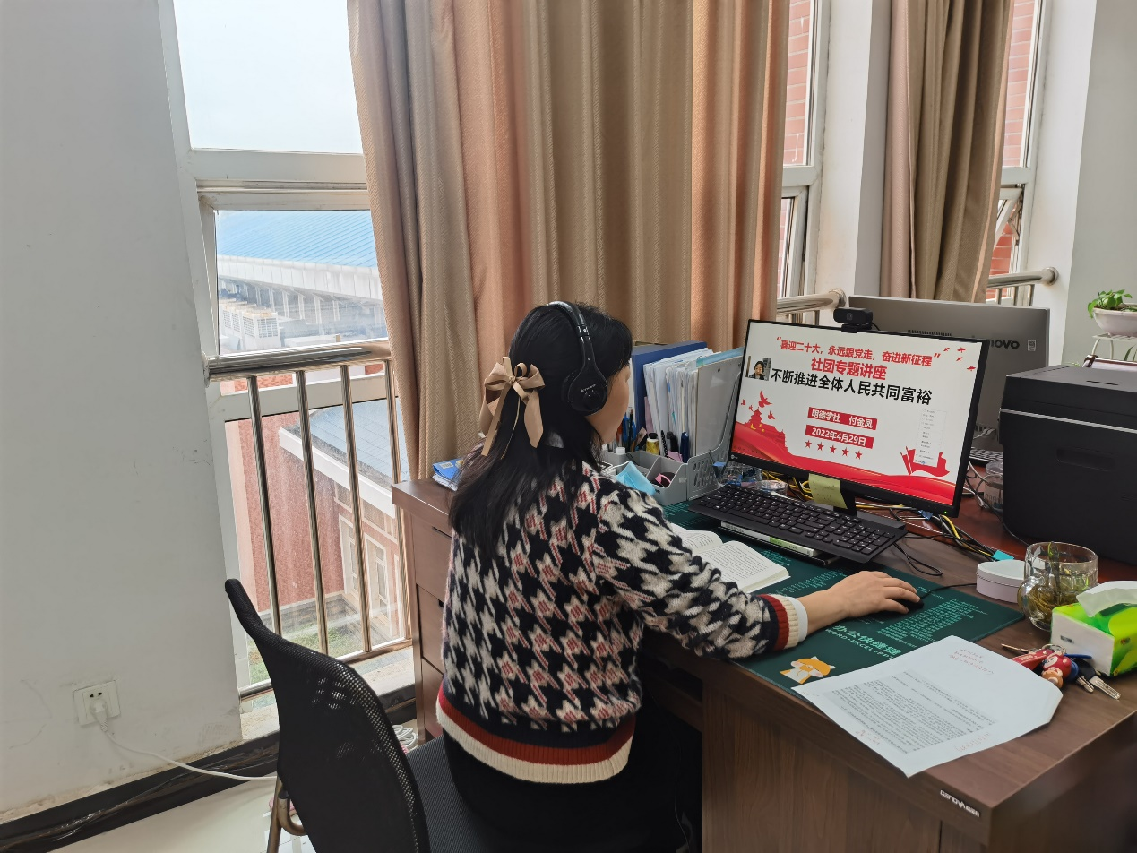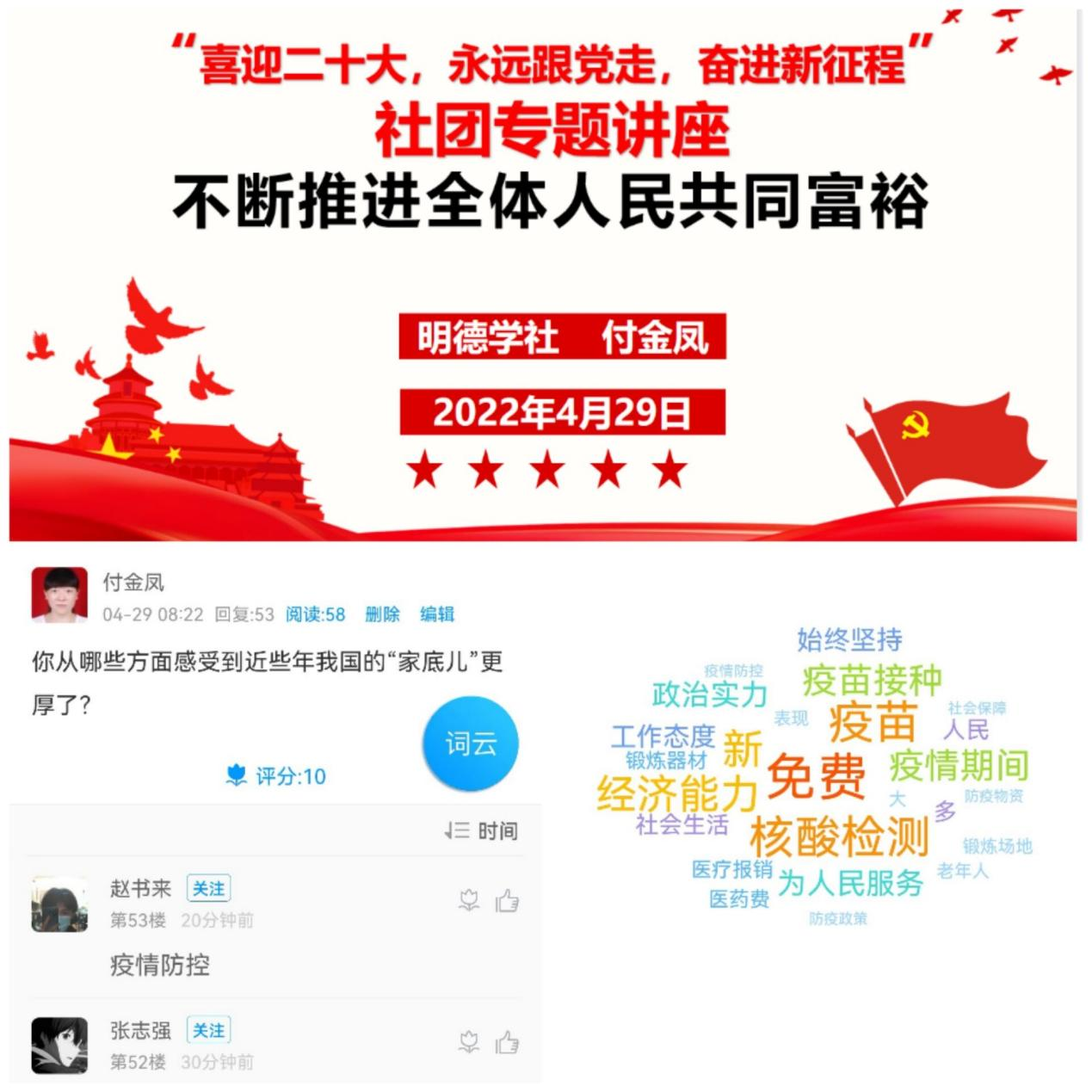 2022年4月29日,新葡的京集团35222vip明德学社通过线上学习通APP开展“喜迎二十大、永远跟党走、奋进新征程”——“不断推进全体人民共同富裕”党史专题讲座。本次讲座主讲人为社团指导老师付金凤,近100名同学参加本次讲座。