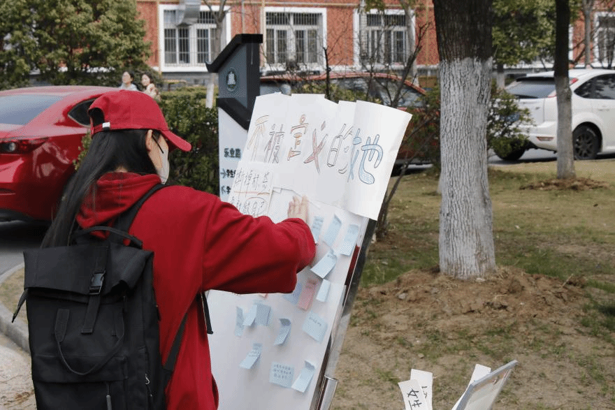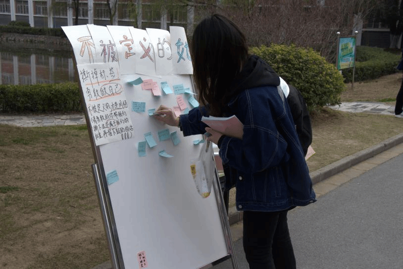 活动中,传统印象标签墙上贴有很多“女生只适合学文科”、“女孩子压力小”、“女生就是马路杀手”等社会对女性固有印象和标签,参与的同学撕下自己不喜欢的标签,再用新的便利贴写下“每个女生都是一颗独具特色的星星在发光”、“爱自己是终身浪漫的开始”带给女生们无穷力量和希望的美好祝愿。无一不在昭示着大家勇敢做自己,拒绝焦虑,拒绝被定义的决心。
