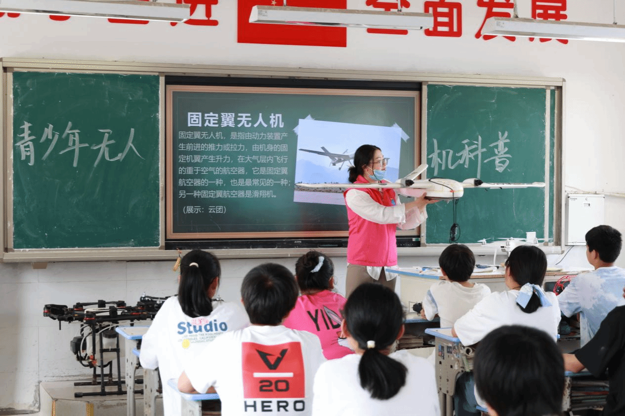 图为智能制造学院梁铮老师在为仓镇中学的学生讲授无人机知识。
