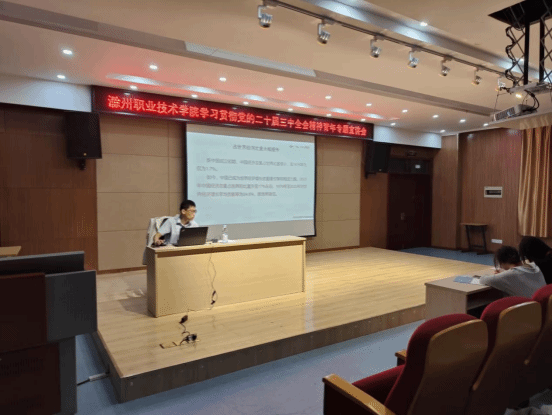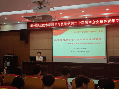 本次学习邀请滁州市“青年讲师团”4位老师进校宣讲,学习内容有《学习贯彻党的二十届三中全会精神(概述)》《健全推动经济高质量发展体制机制》《以青春之力书写中国式现代化新篇章》《以习近平生态文明思想为指引,全面推进美丽中国建设》,课程安排由总体到具体,涵盖党的二十届三中全会精神阐释、经济社会发展、勇担青春重任、生态文明建设等,丰富而有趣味,既贴近现实生活,又能达到学习目的,4位老师的精彩宣讲令学员受益匪浅。