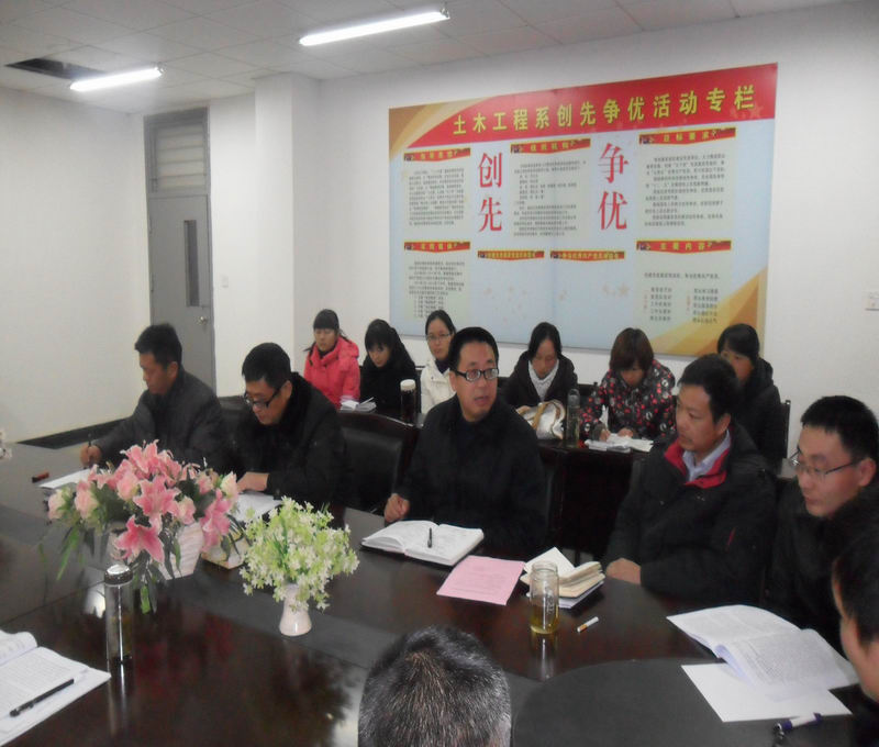 2011年12月12日下午四时,土木系召开教学工作座谈会,出席本次会议的有院长助理刘宏、学生处处长李平权、系主任朱永祥、系书记刘文元、各教研室主任以及骨干教师。首先朱主任代表全系教职员工欢迎院领导来土木系指导教学工作,然后对土木系十年来教学工作进行了总结,并与在座教师讨论了江院长在院教学工作大会上的报告。