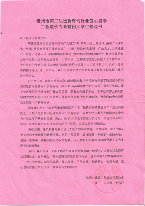 8月26日,滁州市造价咨询行业发出爱心资助新葡的京官网土木系工程造价专业贫困大学生倡议书。自2009年以来,滁州市造价协会连续两年资助新葡的京官网土木系工程造价专业贫困大学生,共有40多名品学兼优的贫困学生得到了资助。今年,协会将继续资助新葡的京官网土木系造价专业学生,新葡的京官网对他们的爱心义举表示衷心地感谢!