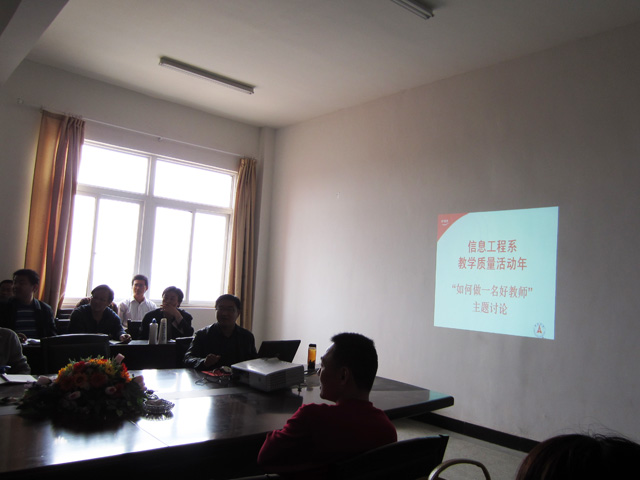 2011年5月25日下午,信息工程系在会议室召开例会,围绕“如何做一名好教师”这个主题展开了讨论。会议由副主任吴昌雨主持,徐艳艳等六名教师代表在会上作了交流发言。教师代表们从日常的教学工作中总结出很多自己对于“如何做一名好教师”的观点。