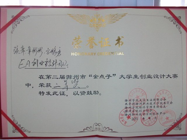 新葡的京官网与滁州学院联合举办的“十年杯”第二届“金点子”大学生创业设计大赛总决赛于4月9日晚落幕。信息系同学张席、章彬彬的EA创业设计团队在辅导员赵盼盼老师的指导下荣获二等奖。