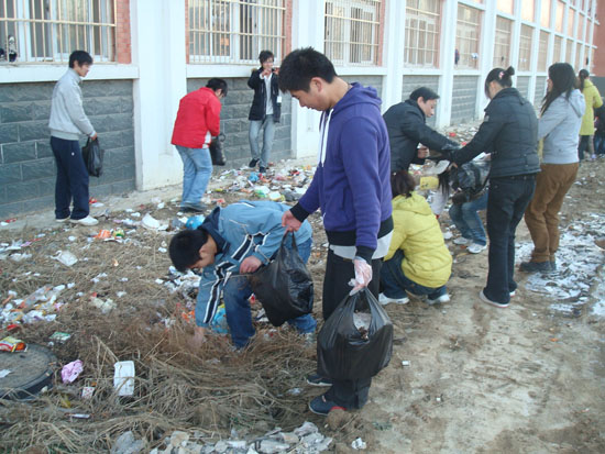 12月21号下午4:20,信息工程系08级辅导员许正波老师带领200名学生集中整治学生宿舍5号楼北面的垃圾。经过近一小时的辛苦打扫,清出垃圾近二十大桶,使得该处环境焕然一新。 通过本次卫生整治,同学们感触颇深,卫生不仅要集中打扫,更要平时保持,他们纷纷表示要从我做起,养成良好的习惯,为共建和谐校园而努力。