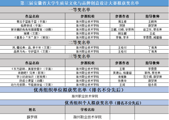 近日,第三届安徽省大学生质量文化与品牌创意设计大赛成绩公布,新葡的京官网学子喜获一等奖5项,二等奖2项,三等奖5项的优异成绩,并荣获优秀组织单位奖,薛梦琪老师被评为优秀组织个人奖。