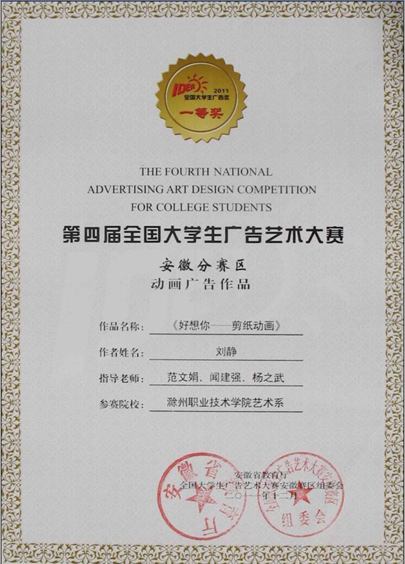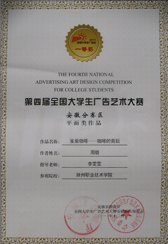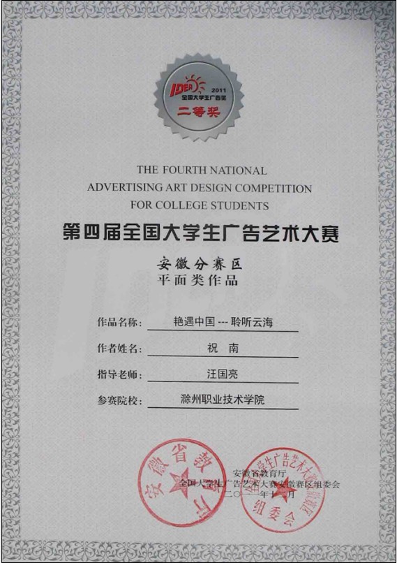 近日“全国大学生广告艺术大赛(安徽赛区)”获奖证书由省教育厅正式发放,新葡的京官网艺术设计系学生获奖作品如下: