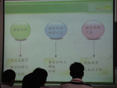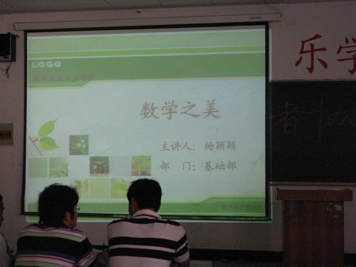基础部高等数学教研室发起指导学院学生数学爱好者协会,5月11日上午,数学爱好者协会在4101教室举行了一个活动。该协会的指导老师基础部高数教研室杨颖颖老师做了一个主题为“数学之美”的讲座。讲座内容主要分为三个部分,第一个部分为数学文化,包括数学的特点和数学文化;第二个部分为现实中的数学之美,包括了黄金分割、螺线、对称、几何;并有很多的图片欣赏;第三部分为数学思维之美,包括建筑城堡,完美正方形。学生在听讲座的过程当中,更加了解数学课程的特点及数学的美,并从实际生活中见识到了数学的美,并提出希望以后学院和协会能多多举办这样的活动。
