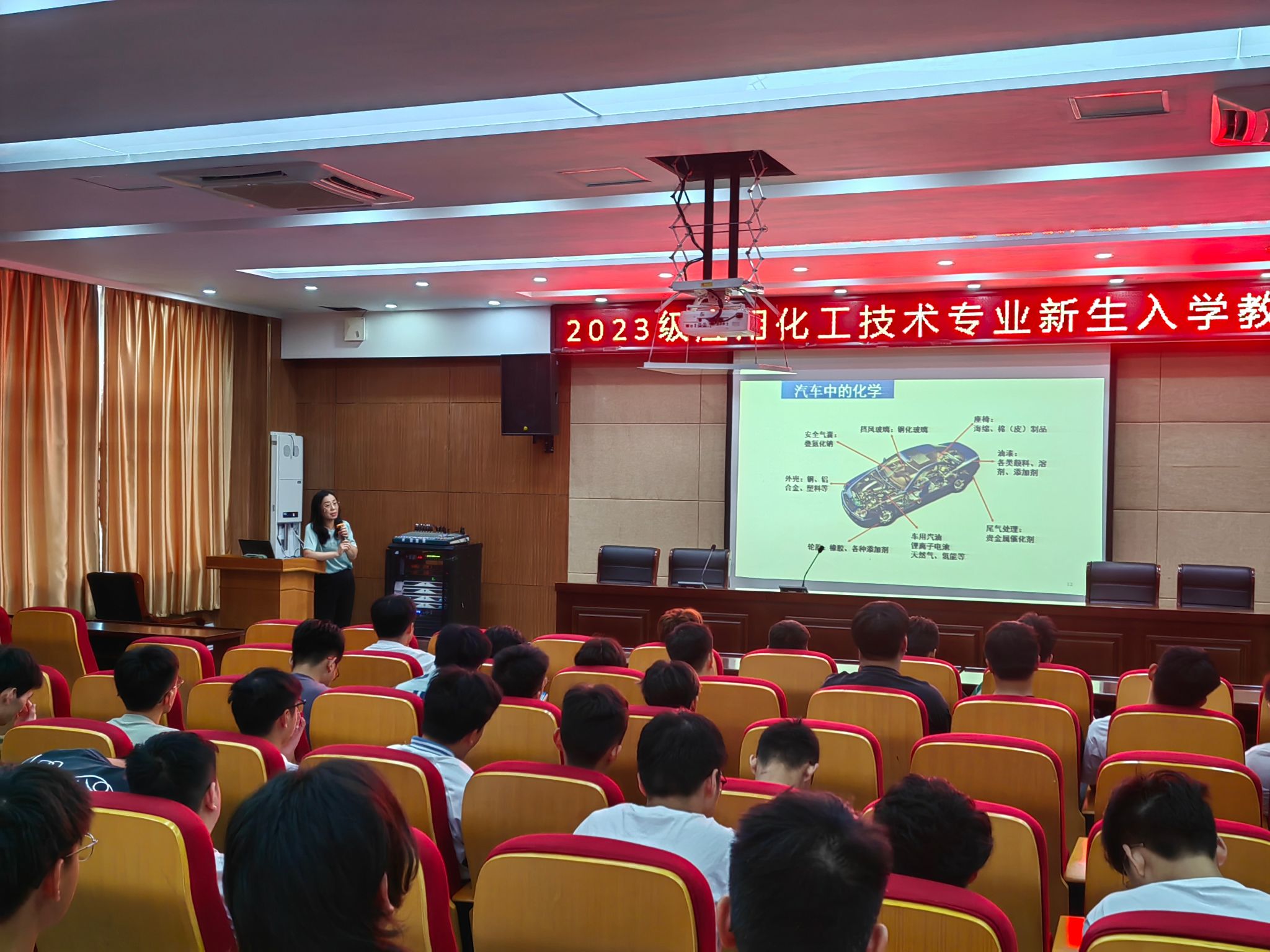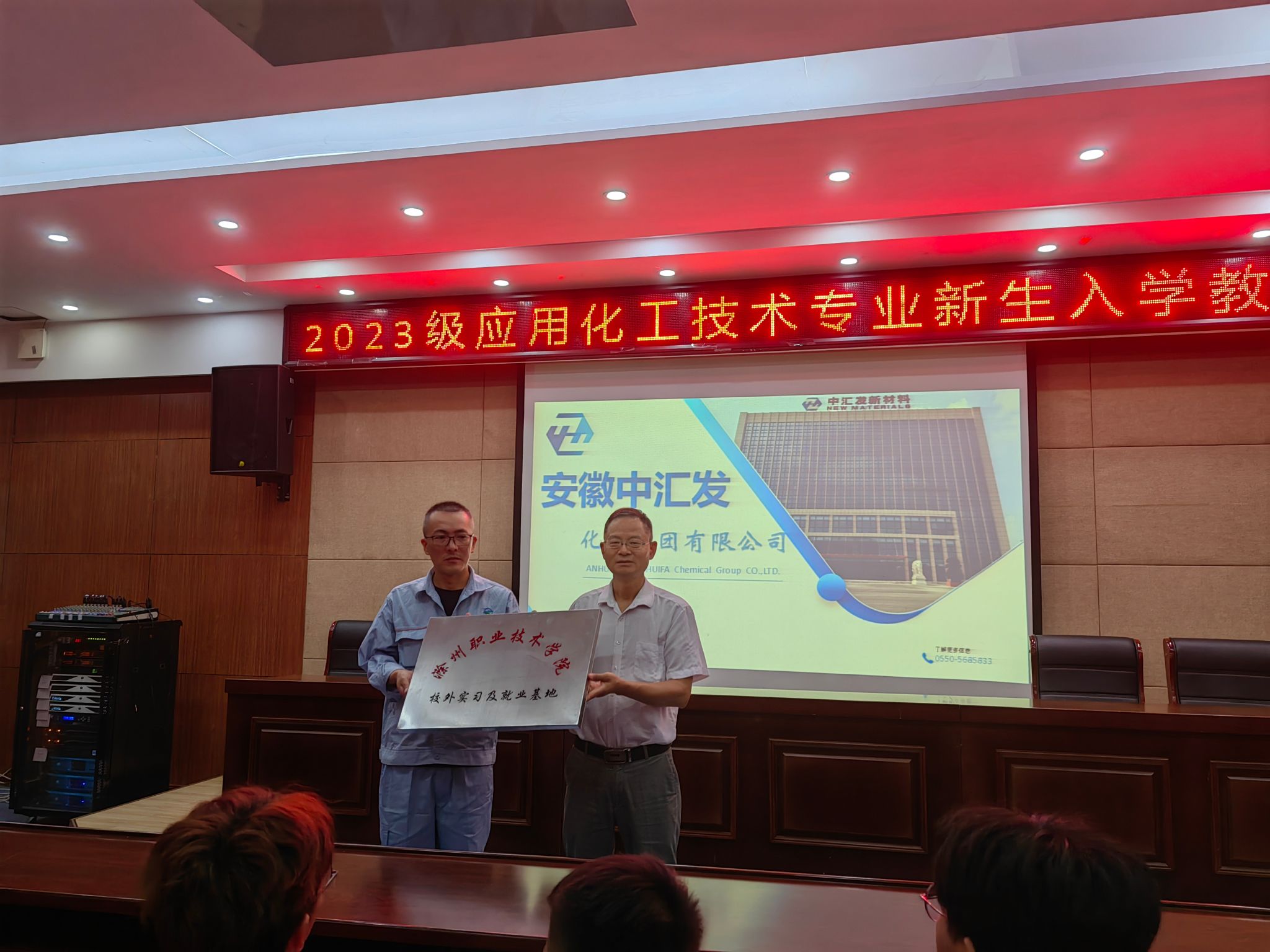 在应用化工技术专业教育现场,专业负责人周玲玲教授从专业发展历史、课程体系、专业特色、就业面向等方面进行详细讲解。优秀校友、安徽中汇发化学集团有限公司副总经理张先涛应邀为新生开展专业发展前景讲座。学院院长梁建军教授与企业负责人现场颁授校外实习就业基地牌匾。
